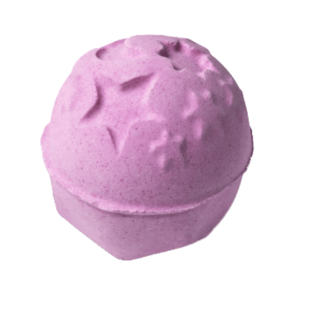 • A round pink and purple Lush bath bomb with a flower in the middle.